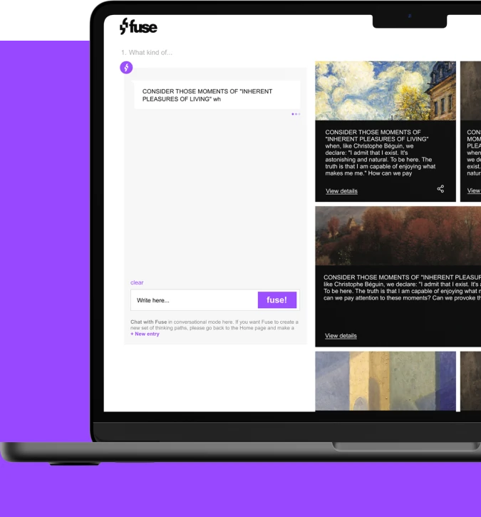 A MadeinWeb desenvolveu uma solução sob medida para a Fuse, criando uma plataforma inovadora impulsionada por inteligência artificial generativa. A interface proporciona uma jornada de exploração artística única, permitindo que o usuário inicie sua pesquisa com um único prompt e seja conduzido por sugestões e conexões inesperadas.
